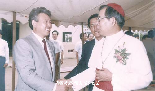 | ▲ 1990년대 중반 명일동성당 설계시 한 행사장에서 김수환(오른쪽) 추기경과 악수하고 있는 김자호 회장. 김자호 회장 제공 |