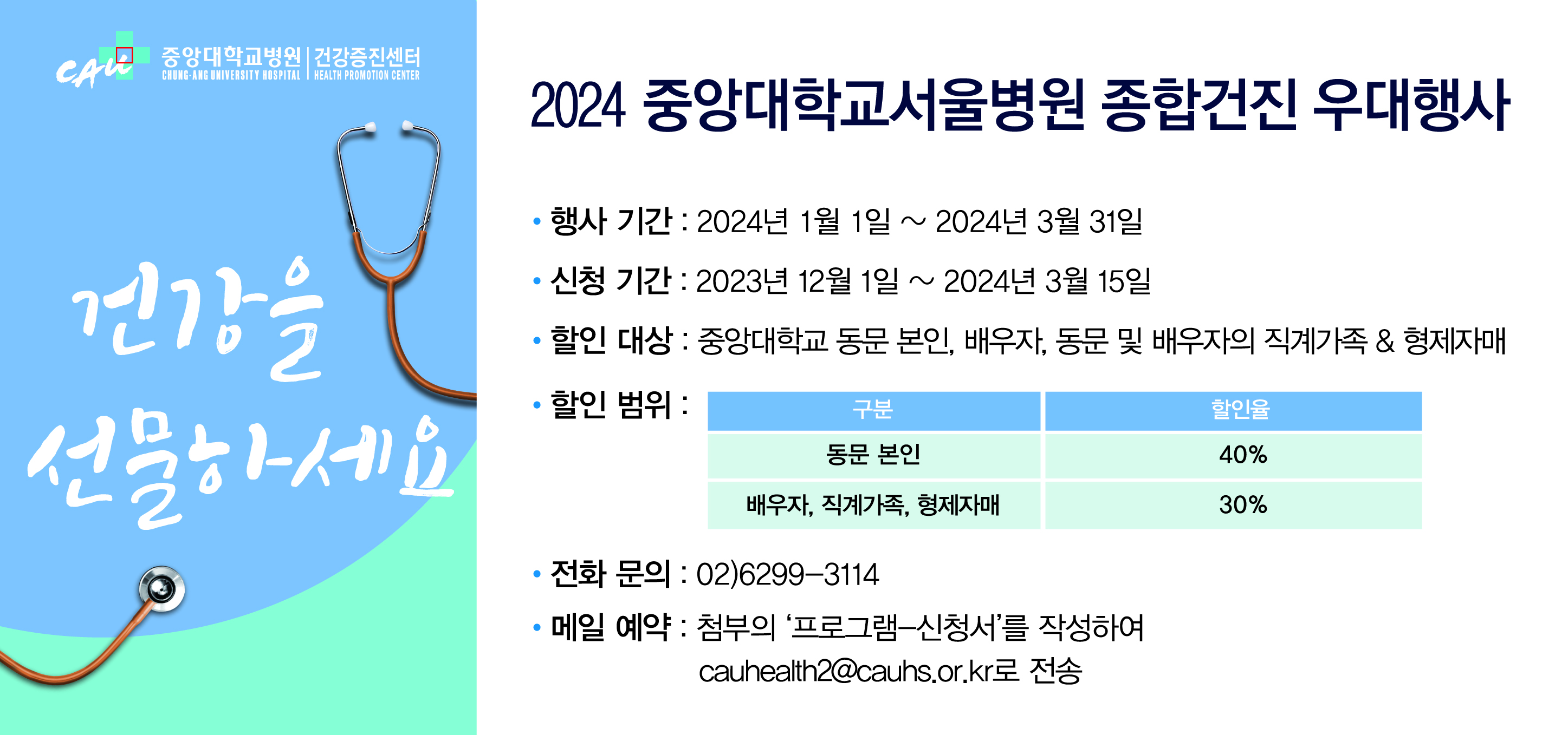 중앙대학교병원 건강검진센터에서 2025년도 중앙대학교 동문회원 및 가족분들 대상으로 아래와 같이 건강검진 할인행사를 진행합니다. *건강검진 할인행사 프로그램, 신청서 등은 첨부파일을 확인하시기 바랍니다.