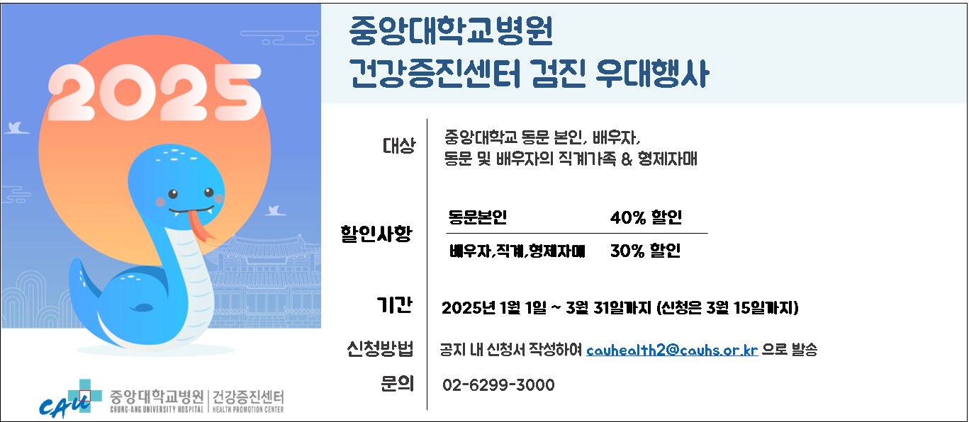 중앙대학교병원 건강검진센터에서 2025년도 중앙대학교 동문회원 및 가족분들 대상으로 아래와 같이 건강검진 할인행사를 진행합니다. *건강검진 할인행사 프로그램, 신청서 등은 첨부파일을 확인하시기 바랍니다.