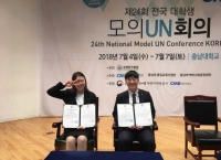 유엔한국협회가 주최하고 충남대학교가 주관한 <제 24회 전국 대학생 모의유엔 대회>에서 우리대학 정치국제학과 4학년 우유경, 3학년 오성수 학생(지도교수 : 장혜영 교수)이 대상인 외교부장관상을 수상하였다. 7월 4일부터 7일까지 진행된 이번 대회는 영...